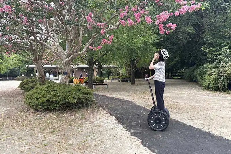 そして昭島口付近では立派なサルスベリに遭遇しました!ツアー中に記念撮影もできるので記念にパシャリ!錦織さんによるとセグウェイに乗っているといつもよりも目線が高くなり、より間近で植物を観察できたり、いつもと違う目線で景色を楽しむことができるそうですよー!