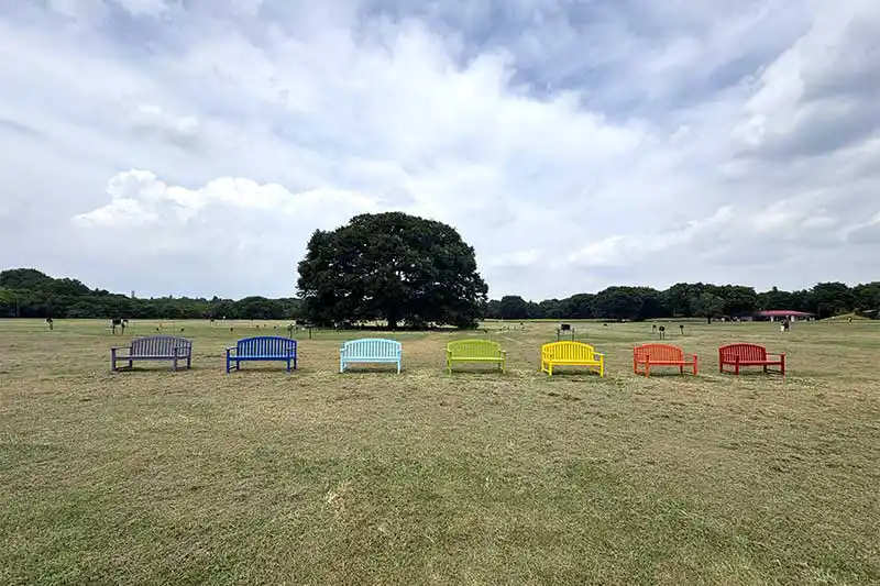 フォトスポットを発見!大ケヤキをバックに7色の椅子が置かれているので、ひと休みがてら記念に1枚撮ってみてくださいね♪