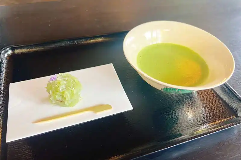 「観楓亭(かんふうてい)」でお店の方が点てた抹茶と露草というお菓子をいただきました!抹茶はまろやかで美味しくて、これがまたお菓子にも合いますね!時期によっては自分でお茶を点てるお点前体験ができるそうです。