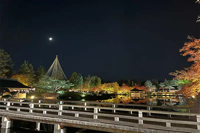 こちらは「コスモスまつりと紅葉・黄葉まつり」期間中のライトアップされた日本庭園!水面に浮かぶ紅葉や建物が幻想的ですね!