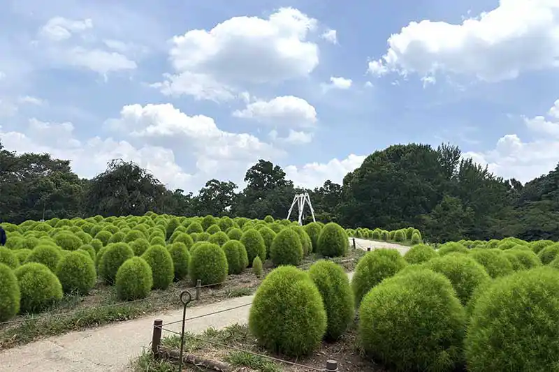 心地よい風を感じながら、すれ違う人と挨拶を交わしてゆったりとした時間を過ごせます!集合場所のさざなみ広場から園内の左側のルートへ進み、渓流広場に到着すると立派な「コキア」が…!コキアといえば赤く紅葉した姿を想像する方が多いかもしれませんが、夏の間は爽やかな緑コキアを楽しむことができますよ~!