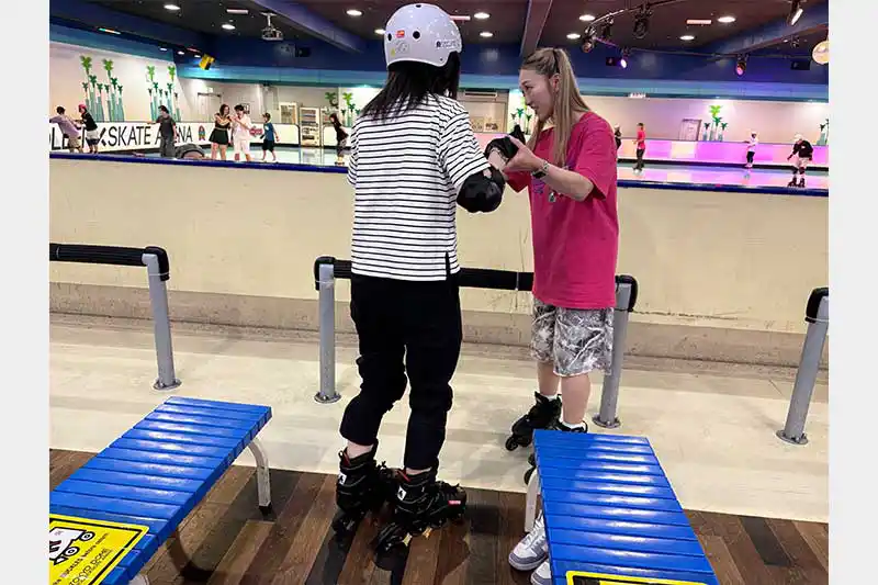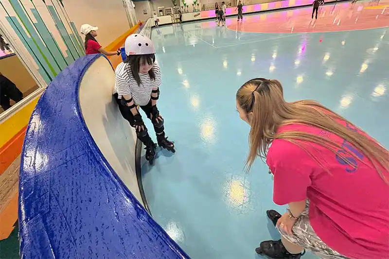 施設には専門インストラクターが常駐しています。日本代表クラスのエキスパート揃いです☆インストラクターはリンク内にいるので、初心者の方も安心してスケートリンクへ足を踏み入れてくださいね!今回の取材では山中さんとWakaさんに支えてもらいながら挑戦してきました!