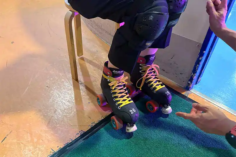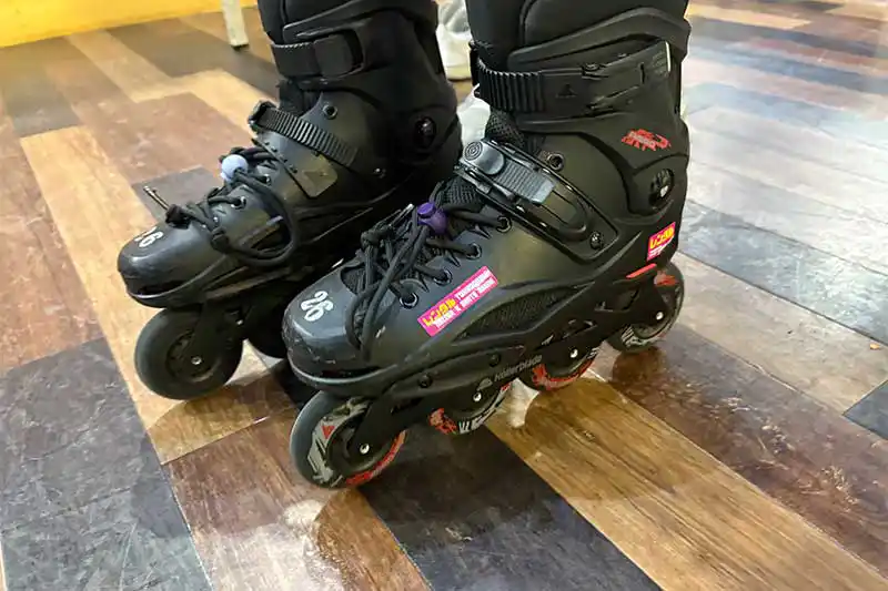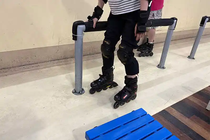 途中から「ローラースケート」に交換してみました!ローラースケートは4つのウィールが前後で2つずつ形状されているスケート靴。インラインスケートより安定して立ち上がりやすいです!