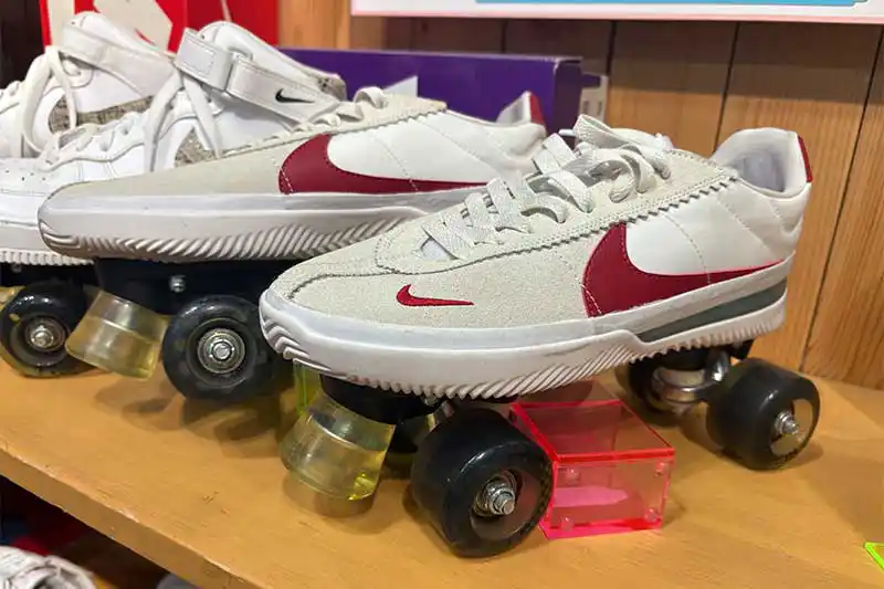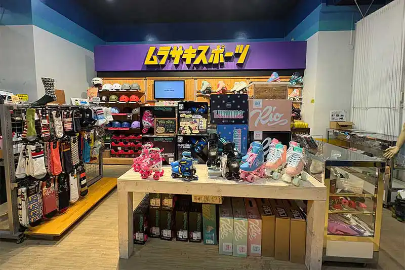 施設内にはスケートを楽しむための商品が購入できます。何より目を惹くのが色とりどりなスケート靴!種類が多すぎて迷ってしまいます。そして事務局スタッフが驚いた商品が「スニーカーローラー」。2000年初期にローラーシューズが流行りましたが、そのローラーシューズより本格的なウィールがついているのが特徴のようです。おしゃれ~!