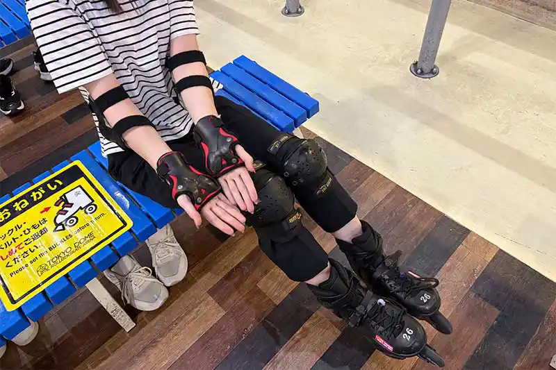 運動が苦手なうえに初体験…な事務局スタッフは「インラインスケート」に挑戦してみることにしました!インラインスケートは靴底に4つのウィールが縦一列に配置されているスケート靴で、後ろに転びにくいことから初心者におすすめです。シューズを履いたら気分はローラースケートで颯爽と走るあのアイドルです♪膝も肘も手首も頭もすべて守る準備が整ったら早速スケートリンクへ移動しましょう!