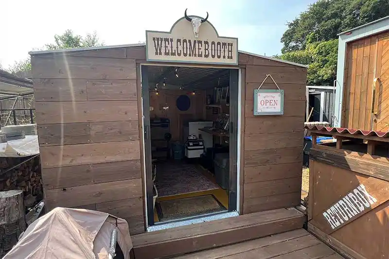 ドッグランを通り過ぎると右側に受付があります!ここでウエスタンな衣装に身を包んだキャストさんに、キャンプ場の案内などが書かれたファイルを渡されチェックインです。チェックアウトはこのファイルを受付付近にある返却ポストに入れるだけで簡単♪