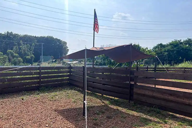 KAL AUTO GARDENでは「ドッグフリーサイト」、「ドッグフリーサイトジャンボ」、「屋根付きサイト(電源付き)」、「星空サイト」、「星空サイト(電源付き)」、「アクティビティサイト」、「はしっこサイト」の7つのサイトがあります。特に柵付き鍵付きで安心な2種類のドッグフリーサイトに設置された「西部開拓タープ」に注目☆ウエスタンな雰囲気を作りつつも荷物を置いたり、涼んだり、何かと便利なミニタープです♪