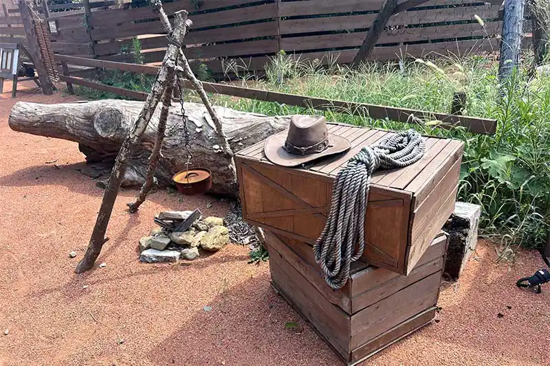 入口のディスプレイにはウエスタンハットやロープ、ウッドボックスなどがあり、キャストさんの衣装やBGMまで、まるで西部開拓時代に迷い込んだような空間が広がっています!そしてこの装飾は手作りらしいですよ!びっくり!