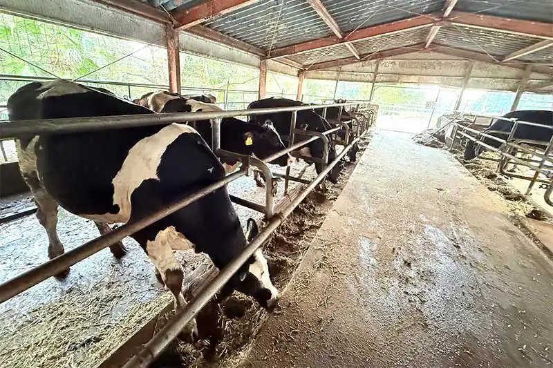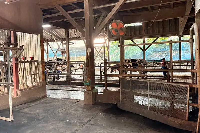 その奥は「成牛」。お食事中の牛さんもいれば、その後ろで好きなように歩いている牛さんもいました。決まった場所に固定ではなく、自分で好きなように自由に動ける育成スタイルなんて珍しいのでは?しかし今年の夏はあまりにも暑くて大変だったとか…。牛さんの上からはミストがかかり、大型扇風機が回っていました~。
