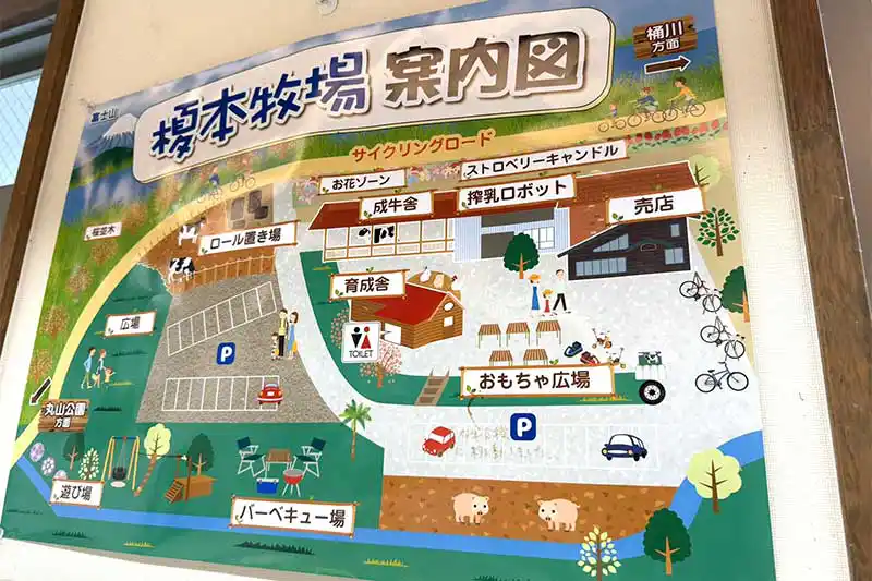 荒川の近くとはいえ、都市エリアに近く市街地からも近いため、まさかいきなり牧場があるとは思えない場所にある都会的牧場!車だけでなく、電車+バスでもアクセスしやすい立地でびっくり!駐車場に到着すると、目の前には乳牛牧場らしくお馴染みの白と黒のホルスタインが放牧場に放たれ、ゆったりとしたお食事姿が見られました。もう気分は広々とした高原牧場のよう!