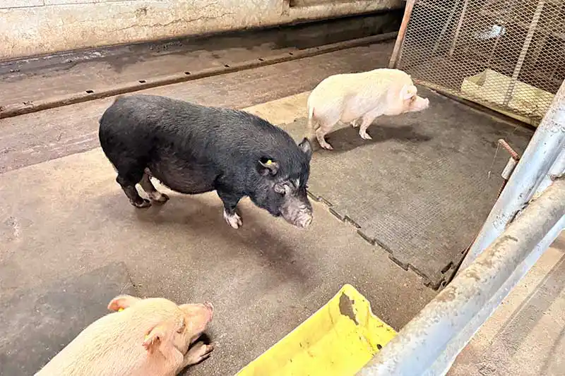 牧場内は無料開放しているので、牛舎も入れます!敷地内の真ん中にあるのが「育成舎」。入るとまずお出迎えしてくれるのが、なんと「ミニブタ」!これまた白と黒の色で統一?きれい好きだと言われるブタさんの場所は本当にとってもきれいでした!!
