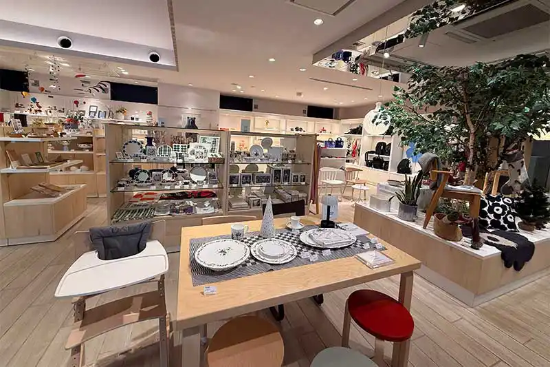 マリメッコ、イッタラなどの人気ブランドが勢ぞろいです。棚には色とりどりのテキスタイルやガラス製品が並び、見ているだけで心がときめく空間です。