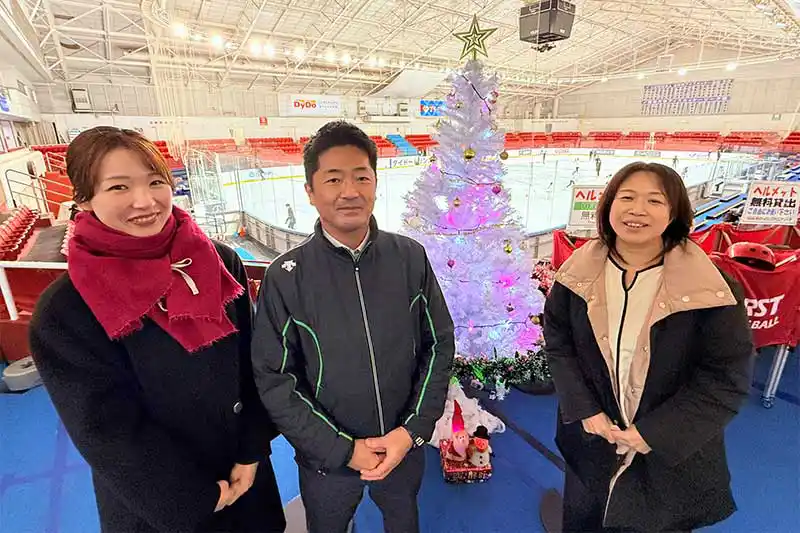 土日や年末年始は大学のアイスホッケーリーグ大会などが行なわれているそうです!迫力満点の試合を観戦するのも楽しいですね♪他にもプロのアイスショーやイベントも行なっていますので是非チェックしてご来場ください!とスタッフの皆さん。(左から濱田さん、遠藤支配人、能澤さん)