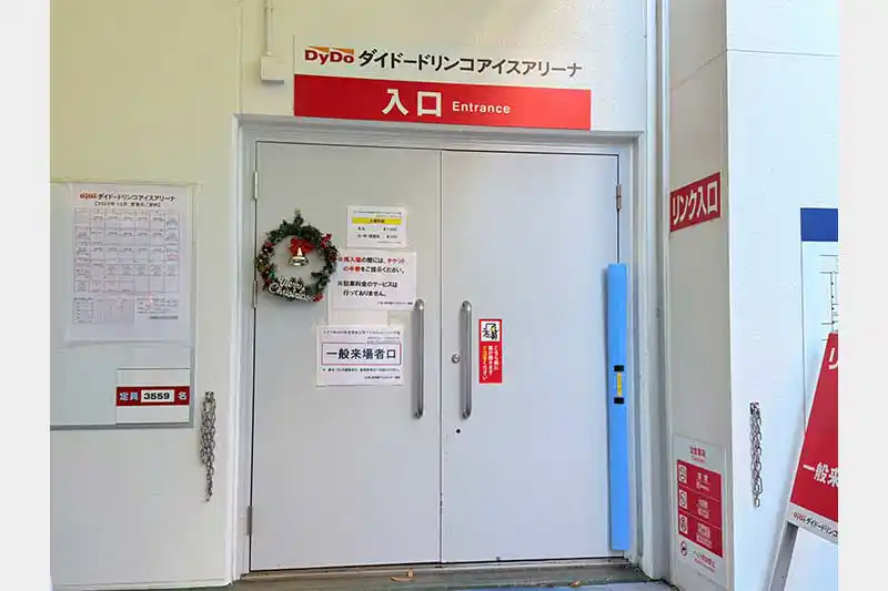 こちらが入口。ドアを開けて中に入るとすぐに氷のリンクが目に飛び込んできます。そして、一気に寒い!!ダウンを着ていないと寒いくらいの温度!!アリーナ内は10℃くらいなので防寒対策はしっかりとしていかないとですね。