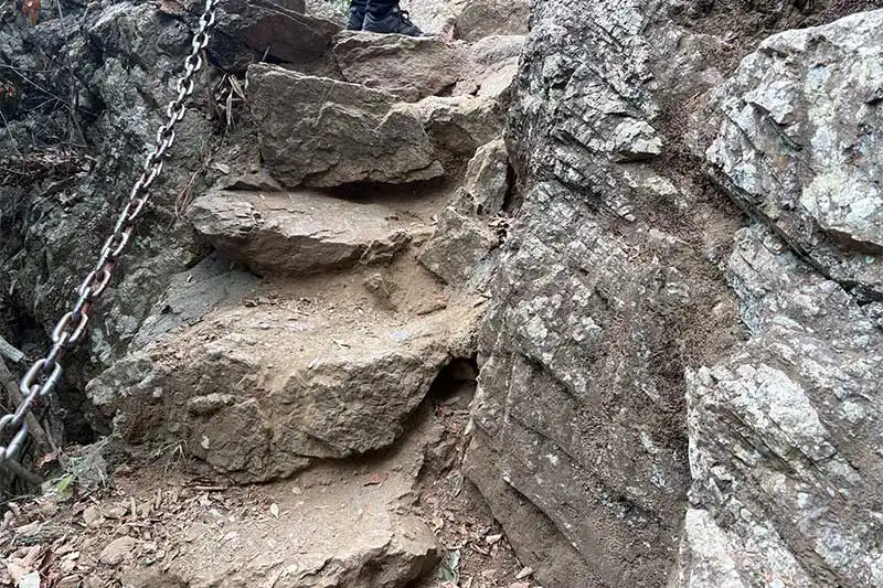 中段を過ぎると、ゴツゴツとした岩場の道が現れやや険しめに。10分ほど歩き続けると、頂上に到着です!!