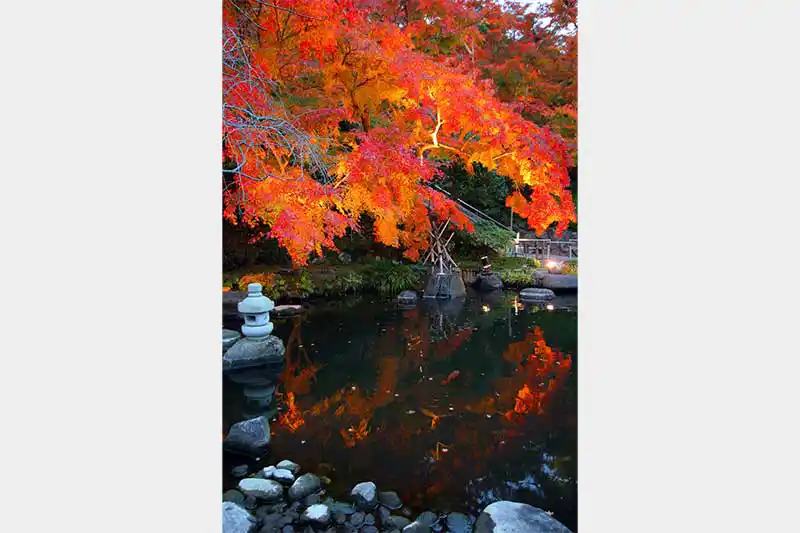 明るいうちから照明を点灯します。徐々にくれ行く中、紅葉した木々が照らされて行く様子はとても幻想的です。