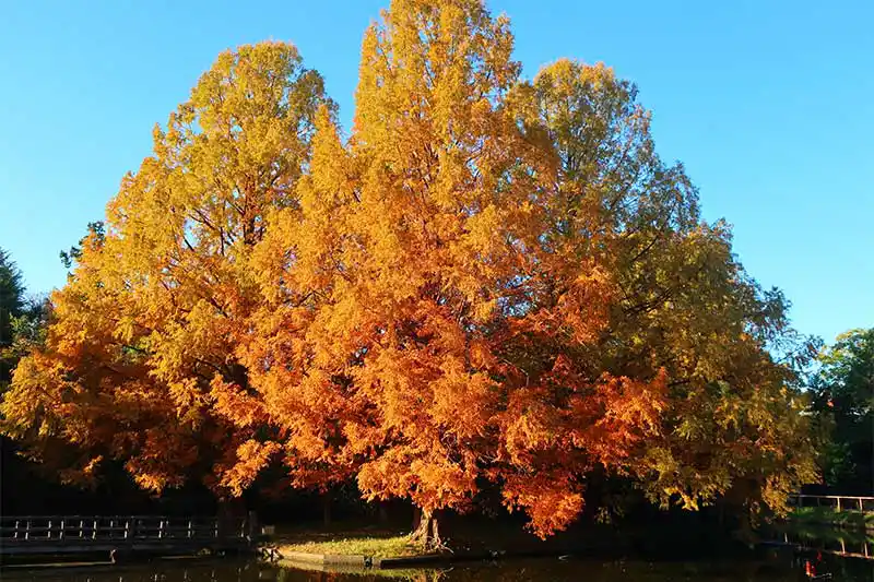 ヤマモミジやイチョウ、メタセコイヤが色づき、非常に華やかです。貸しボートの営業が再開されたため、ボートから紅葉を眺めることもできます。
