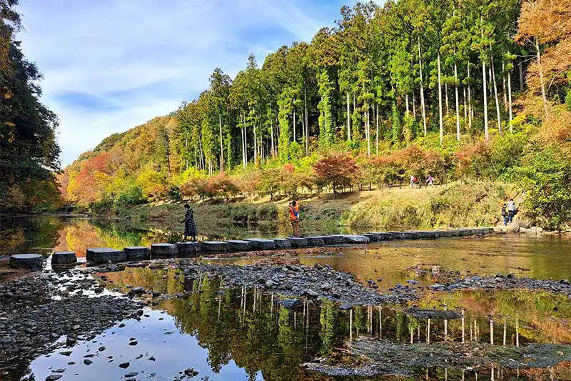 「嵐山渓谷」は、周囲の木々が華やかに織りなす紅葉と槻川の清流に映る彩りを楽しめる、埼玉県屈指の紅葉スポットです。日比谷公園などの設計に携わった日本最初の林学博士・本多静六博士が当地を訪れた際、槻川橋から眺めた渓谷と周辺の紅葉の美しい景観が、京都の嵐山の風景によく似ていると“武蔵国の嵐山”と命名され、町名の由来になりました。見どころは、槻川を石で渡る「飛び石」付近と、展望台から与謝野晶子歌碑へ向かう遊歩道。カラフルなグラデーションと燃えるようなモミジをお楽しみください。