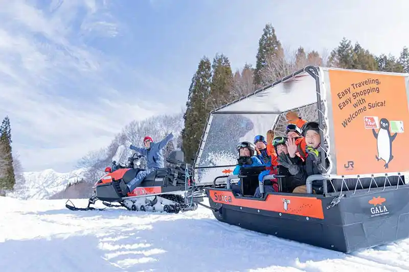6人乗りの大きなソリをスノーモービルで引っ張り、皆さまを非日常的な世界へご案内いたします。爽快に雪の上を走る感覚はこのツアーの醍醐味です。スノーモービルの運転席に乗って記念撮影など、小さなお子様にも大人気のアトラクションです!