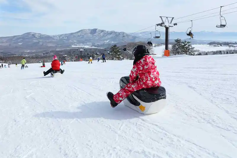 エリア内にある第3リフトや動く歩道を利用して行うソリ遊びは家族みんなで童心に返る事が出来る。
